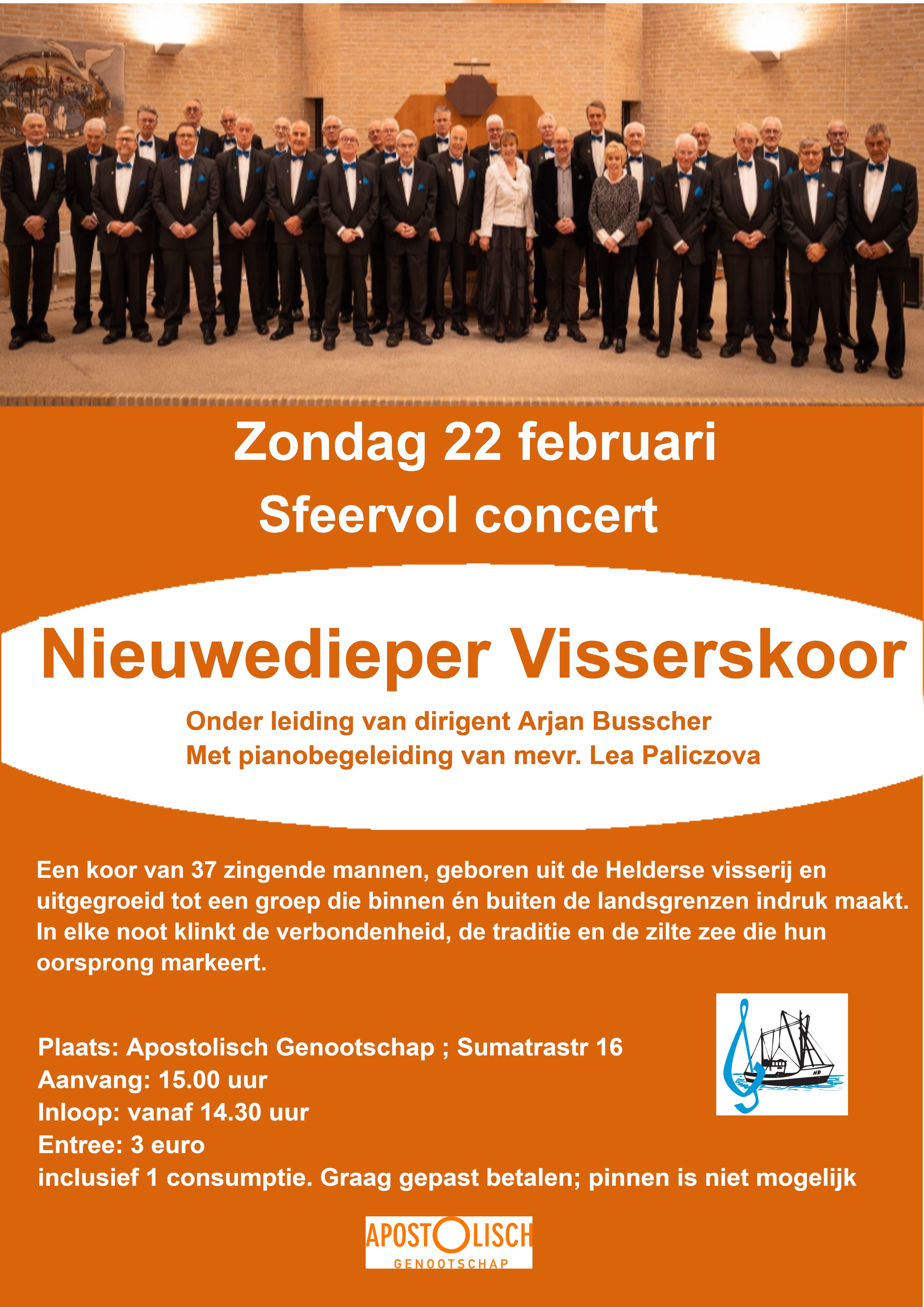 Op zondag 22 februari geeft het Nieuwedieper Visserskoor een sfeervol optreden in het Apostolische Genootschap, Sumatrastraat 16.