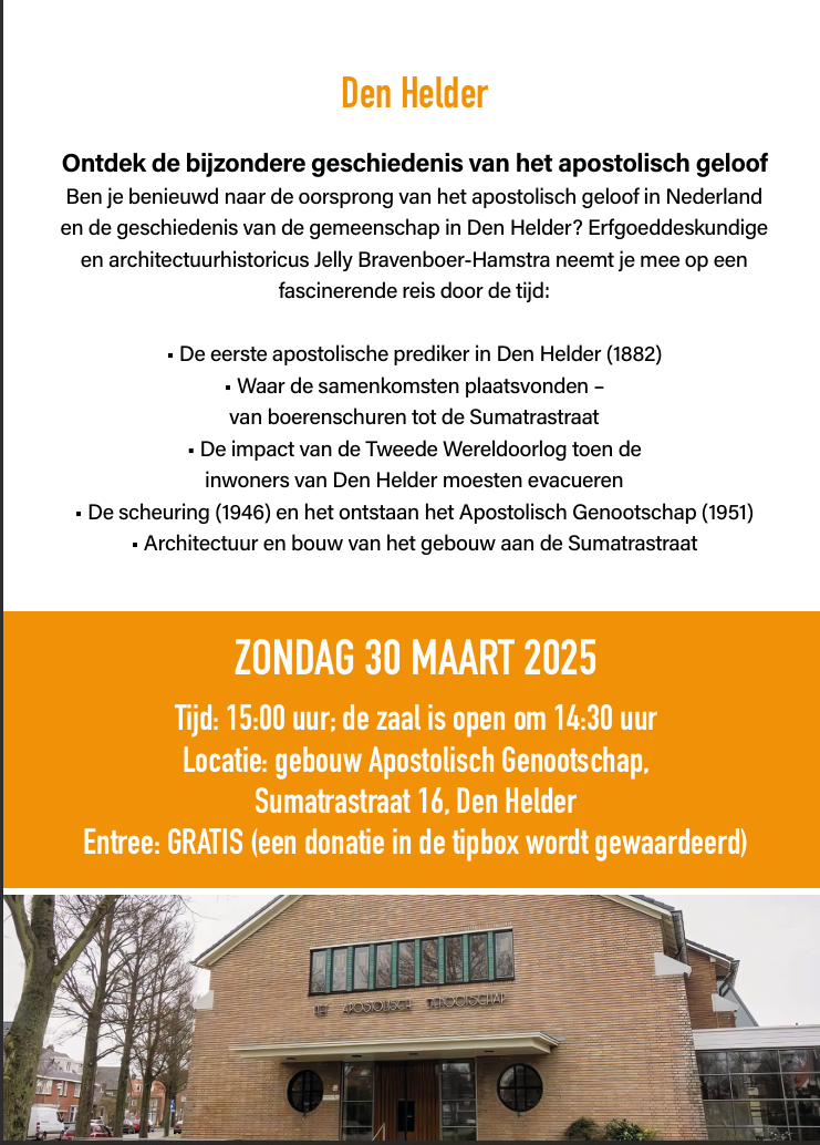 De presentatie van erfgoeddeskundige en architectuurhistoricus Jelly Bravenboer-Hamstra op zondag 30 maart in het Apostolisch Genootschap in Den Helder was een boeiende middag vol verhalen en anekdotes over de geschiedenis van het Apostolisch geloof in Nederland, met een speciale focus op Den Helder vanaf 1882.